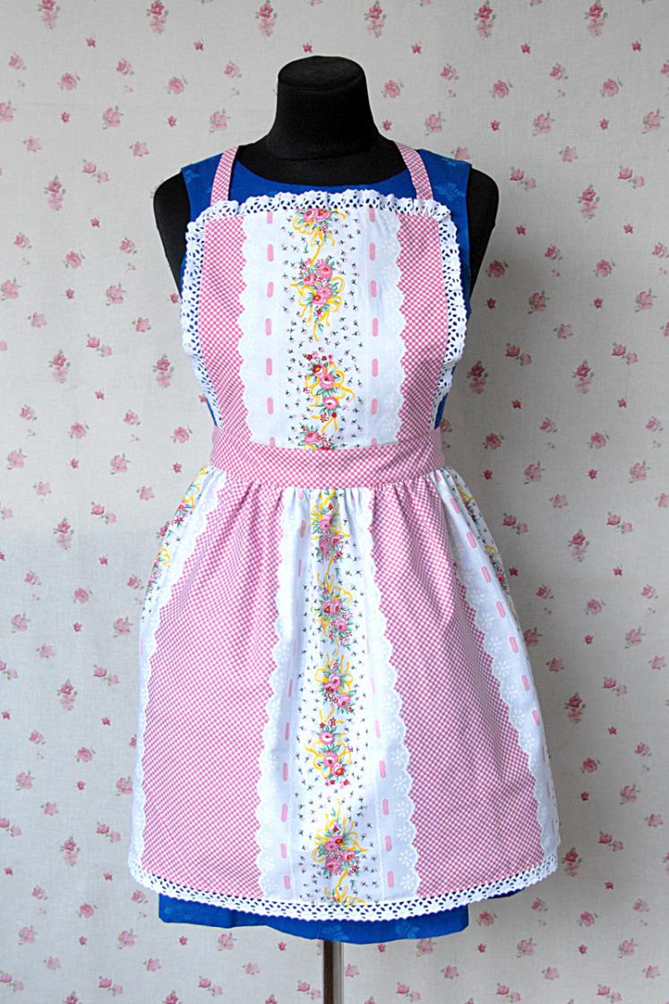 Материалы и детали: бело-розовый хлопок в клеточку с цветочным принтом, льняное кружево; верх передника на мягкой подкладке.
