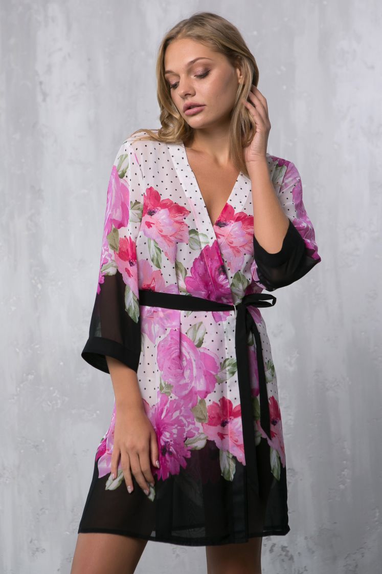 Материалы и детали: мягкий шелковистый полуматовый сатин, удобный крой кимоно, рукава ¾, поясок зафиксирован на спинке.